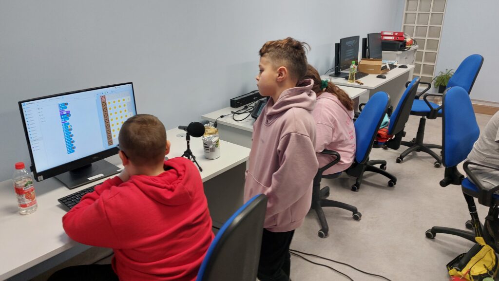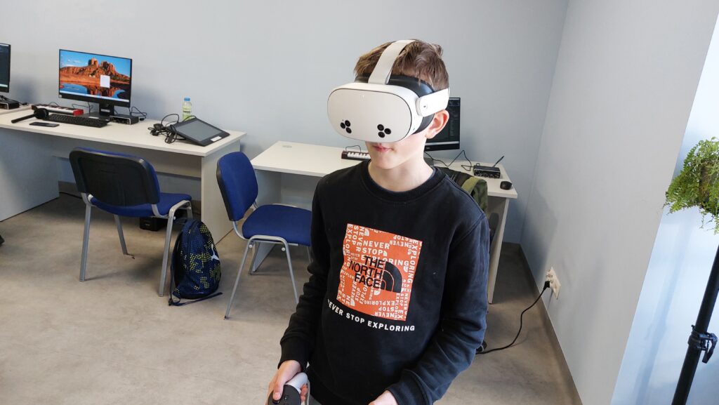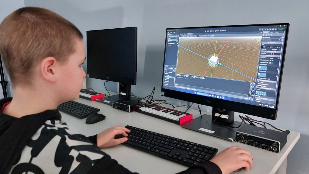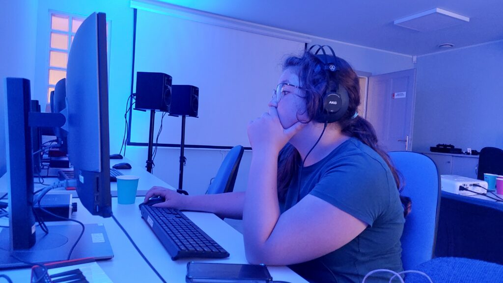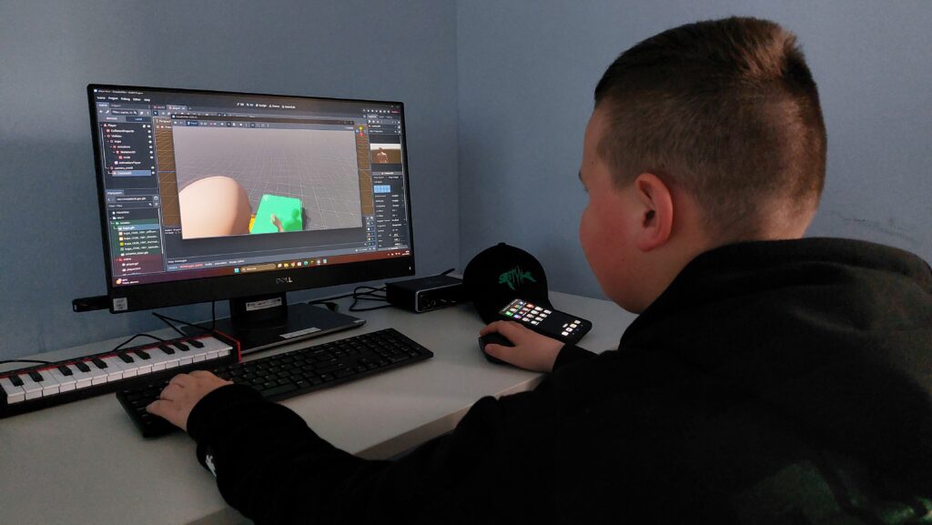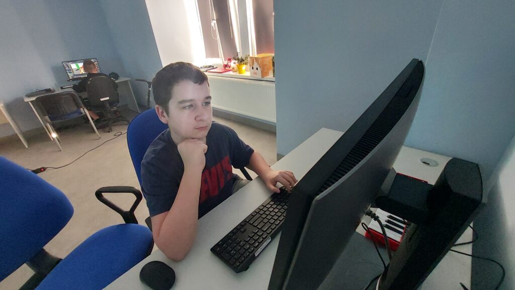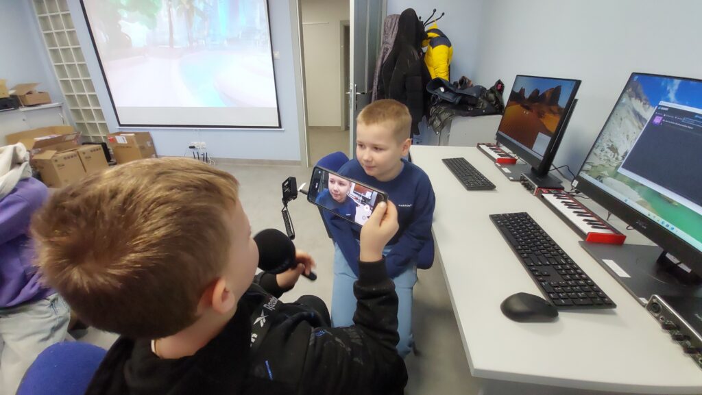 Ważną częścią zajęć był storytelling – czyli tworzenie fabuły i świata przedstawionego. Uczestnicy pisali własne historie, uczyli się jak opowiedzieć je za pomocą obrazu, dźwięku i animacji. Projektowali scenariusze, dialogi i budowali emocjonalne struktury narracyjne. Współpracowaliśmy ze Studiem Nagrań, gdzie uczestnicy mogli nagrać ścieżki dźwiękowe i efekty audio do swoich projektów. Część narracyjna rozwijana była również dzięki współpracy z grupą plastyczną, której prace plastyczne były wykorzystywane w budowie świata gry.