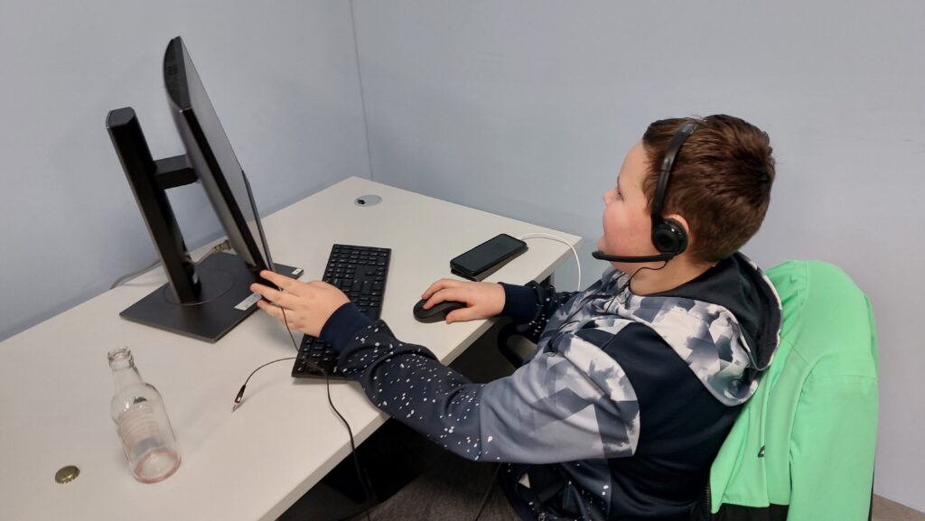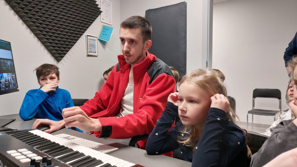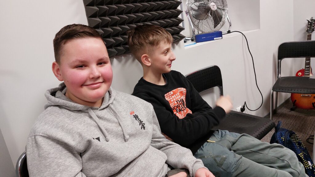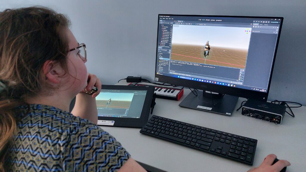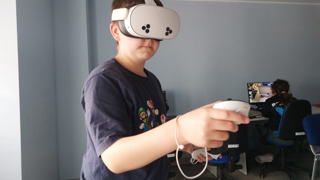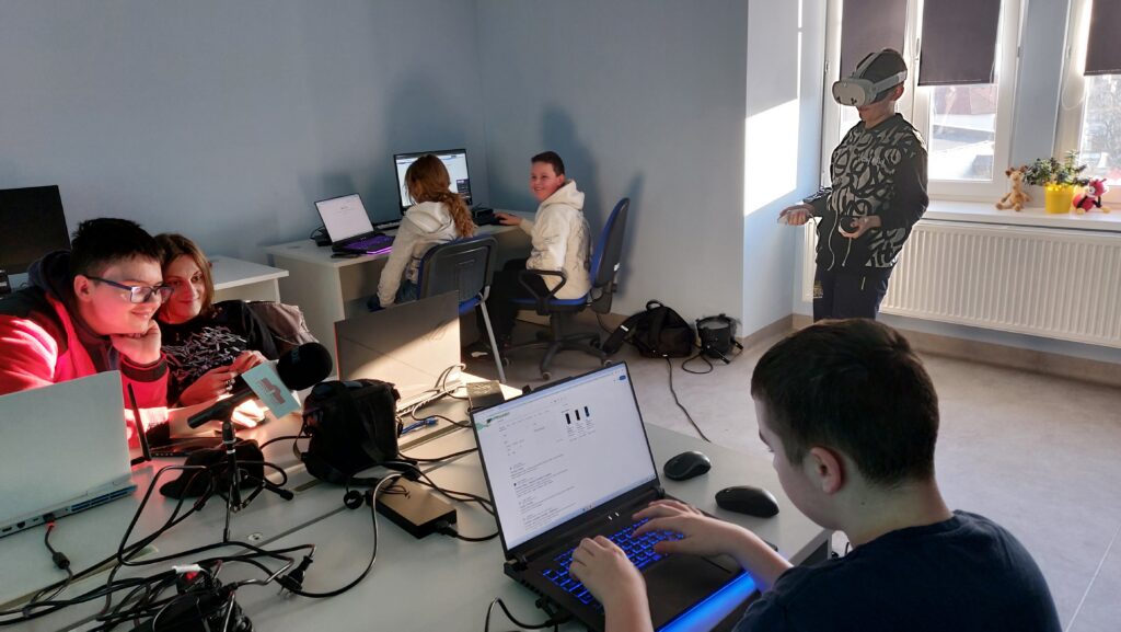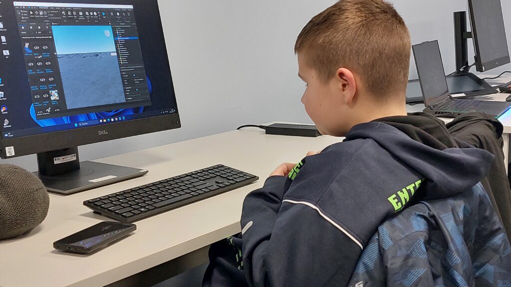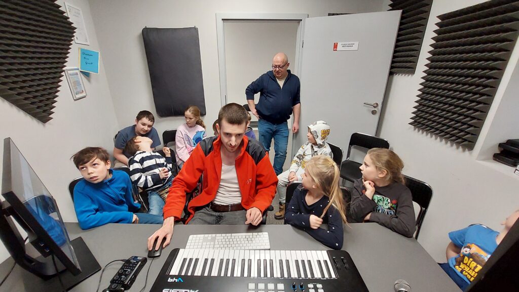 Ważną częścią zajęć był storytelling – czyli tworzenie fabuły i świata przedstawionego. Uczestnicy pisali własne historie, uczyli się jak opowiedzieć je za pomocą obrazu, dźwięku i animacji. Projektowali scenariusze, dialogi i budowali emocjonalne struktury narracyjne. Współpracowaliśmy ze Studiem Nagrań, gdzie uczestnicy mogli nagrać ścieżki dźwiękowe i efekty audio do swoich projektów. Część narracyjna rozwijana była również dzięki współpracy z grupą plastyczną, której prace plastyczne były wykorzystywane w budowie świata gry.