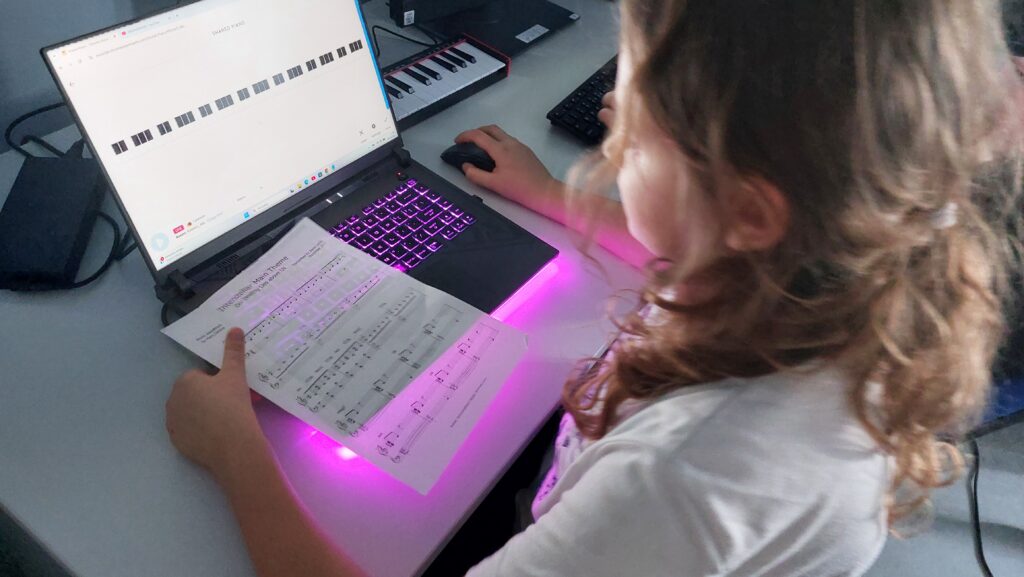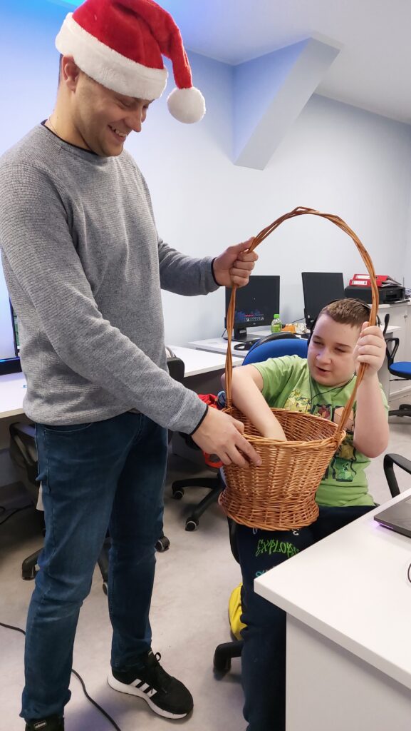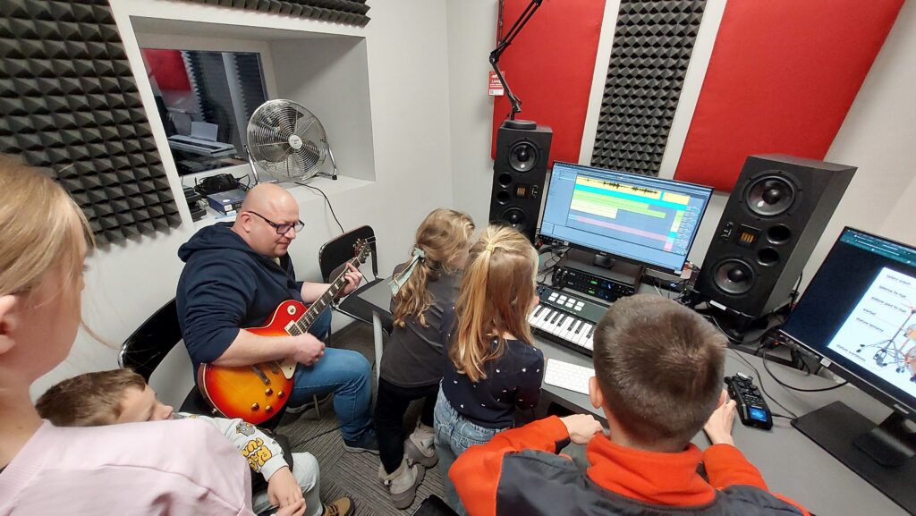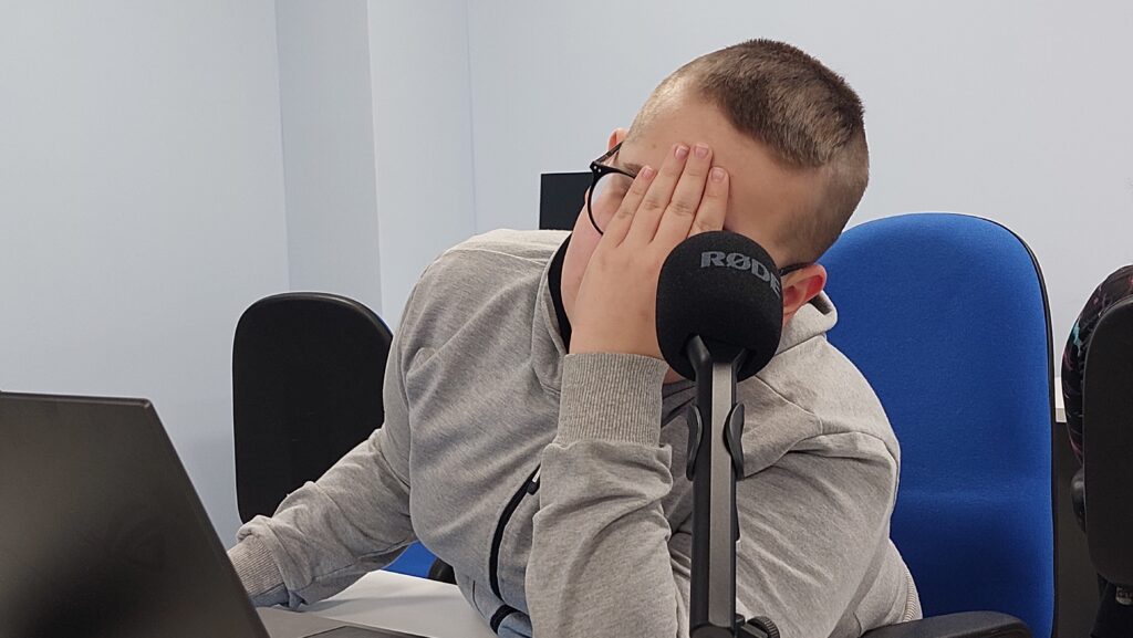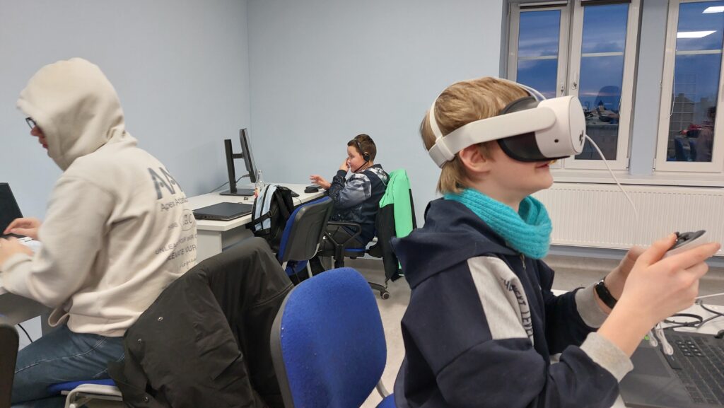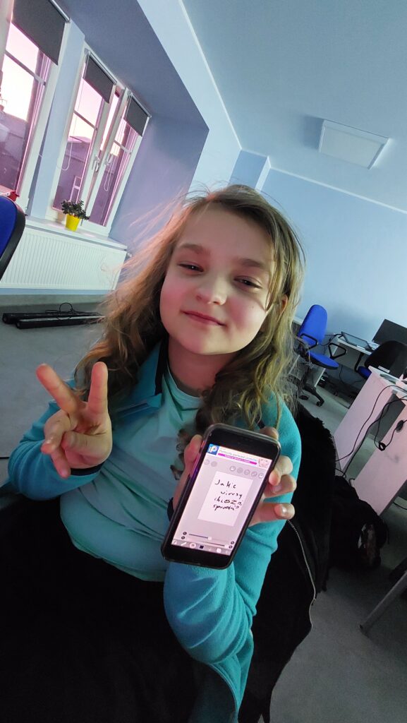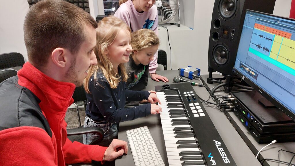 Ważną częścią zajęć był storytelling – czyli tworzenie fabuły i świata przedstawionego. Uczestnicy pisali własne historie, uczyli się jak opowiedzieć je za pomocą obrazu, dźwięku i animacji. Projektowali scenariusze, dialogi i budowali emocjonalne struktury narracyjne. Współpracowaliśmy ze Studiem Nagrań, gdzie uczestnicy mogli nagrać ścieżki dźwiękowe i efekty audio do swoich projektów. Część narracyjna rozwijana była również dzięki współpracy z grupą plastyczną, której prace plastyczne były wykorzystywane w budowie świata gry.
