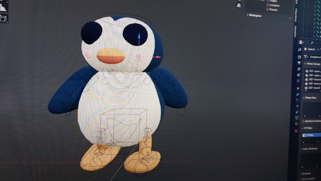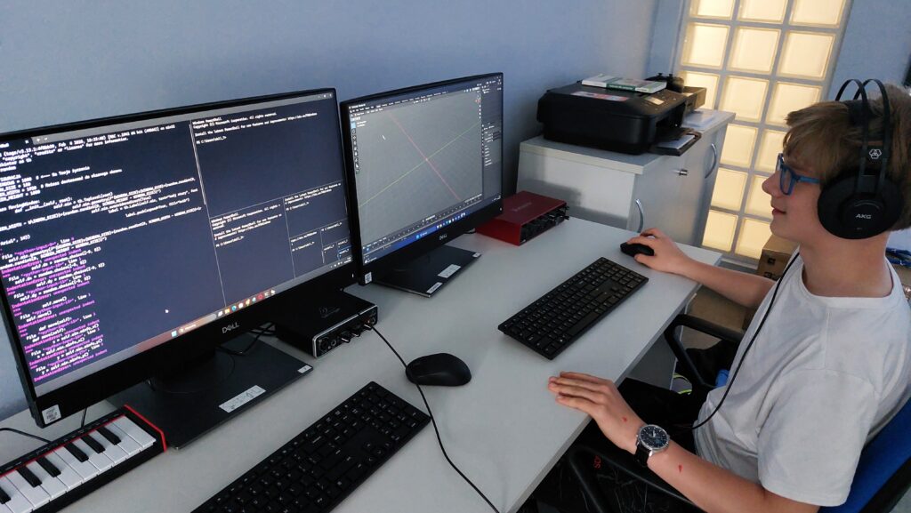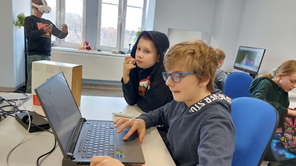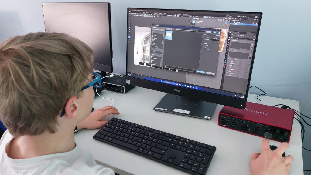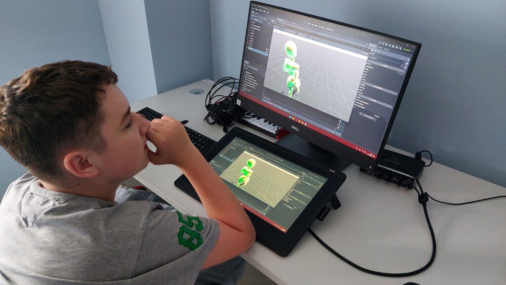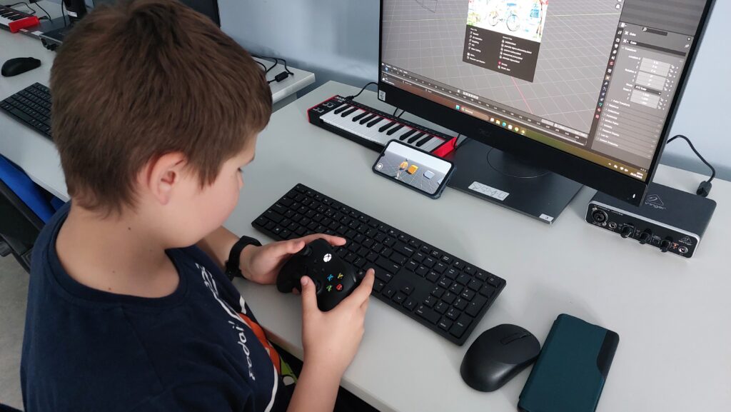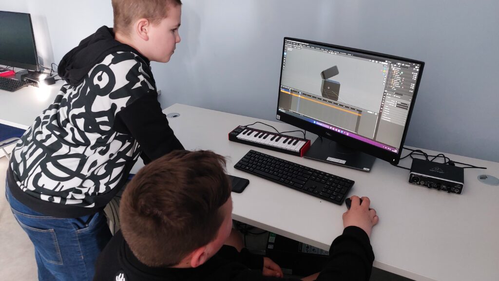 Dużym elementem programu była grafika 3D. Rozpoczęliśmy od modelowania prostych obiektów w Blenderze, następnie uczyliśmy się teksturowania, tworzenia lowpoly modeli oraz przygotowania modeli do animacji. Wprowadziliśmy uczestników w świat riggingu – budowania szkieletu, kości i animowania postaci. Korzystaliśmy z narzędzi takich jak Rokoko do tworzenia animacji motion capture, a także z AI wspierającego generowanie modeli 3D ze zdjęć.