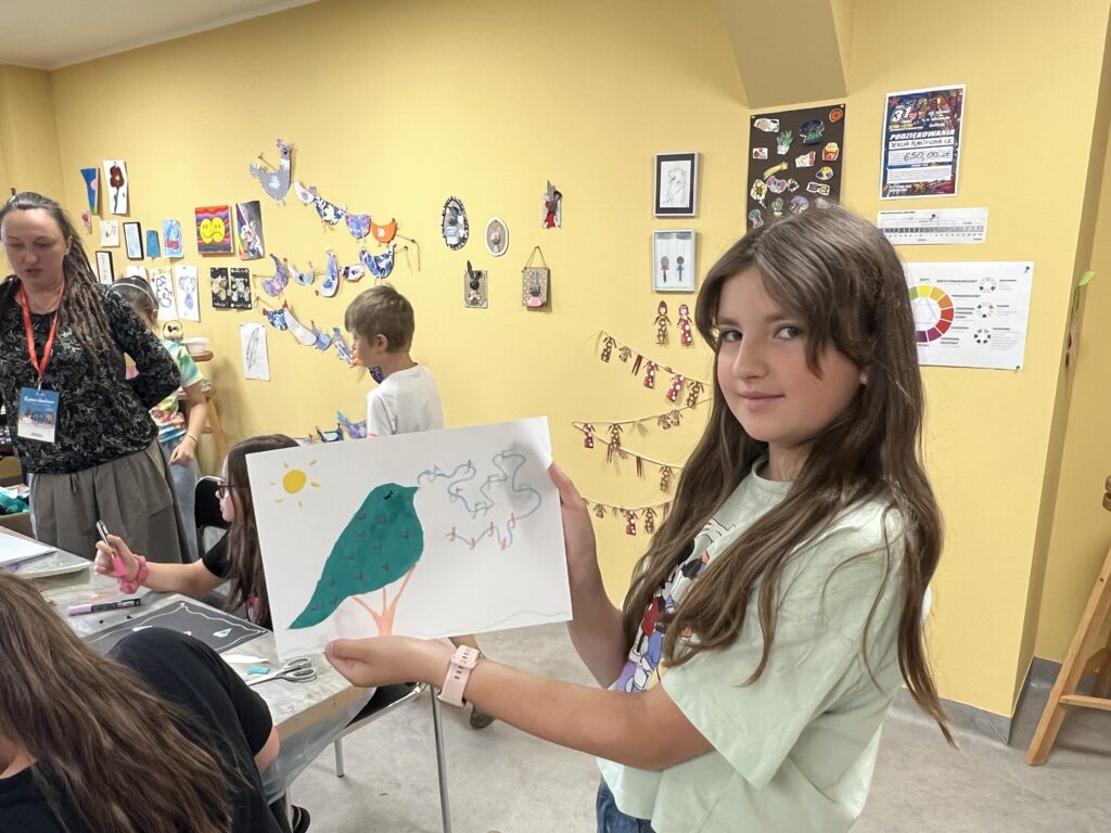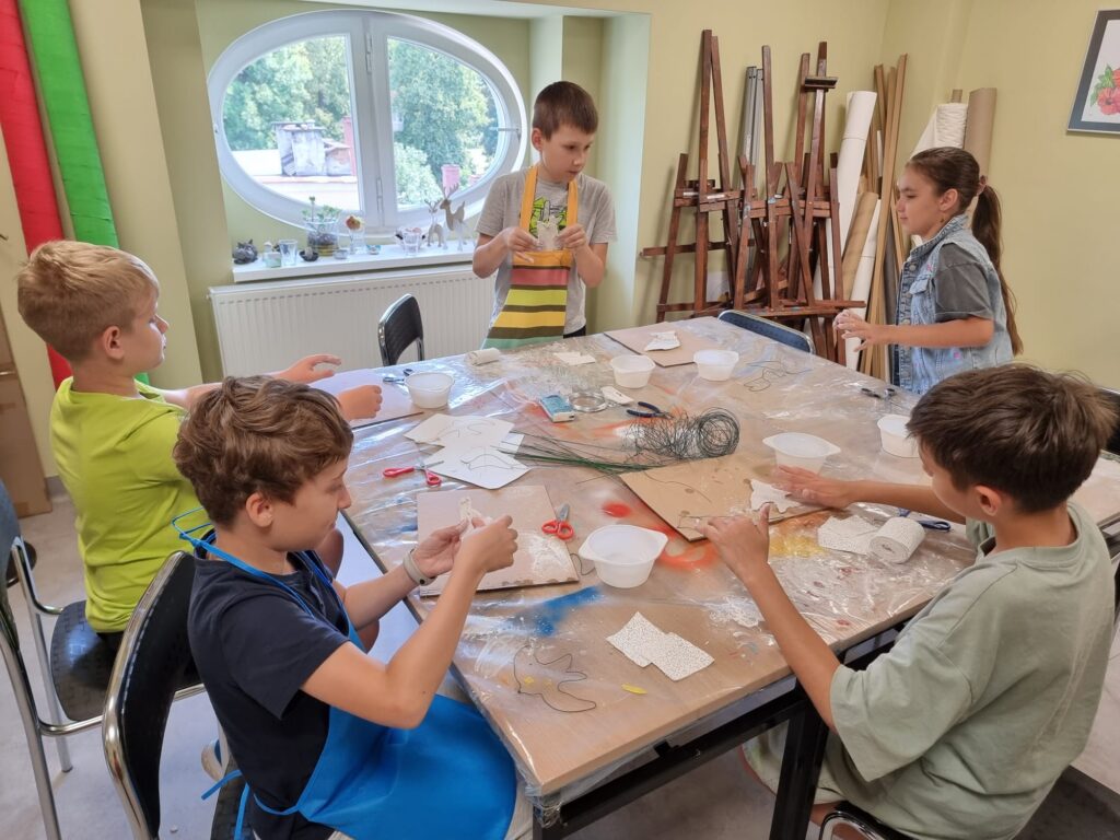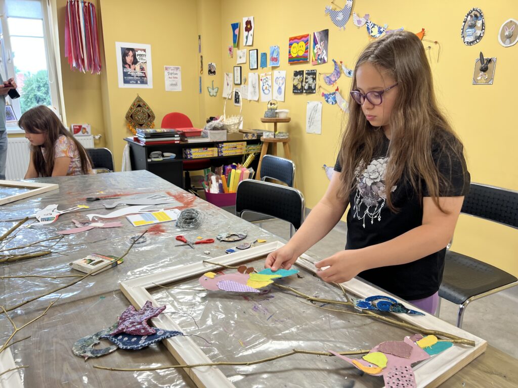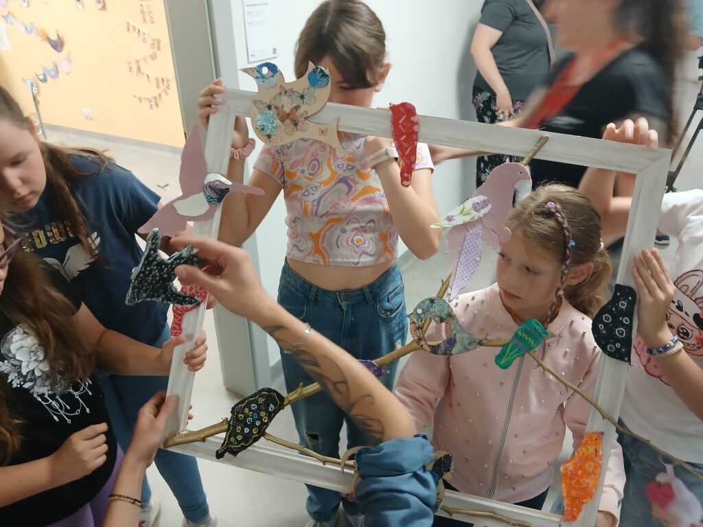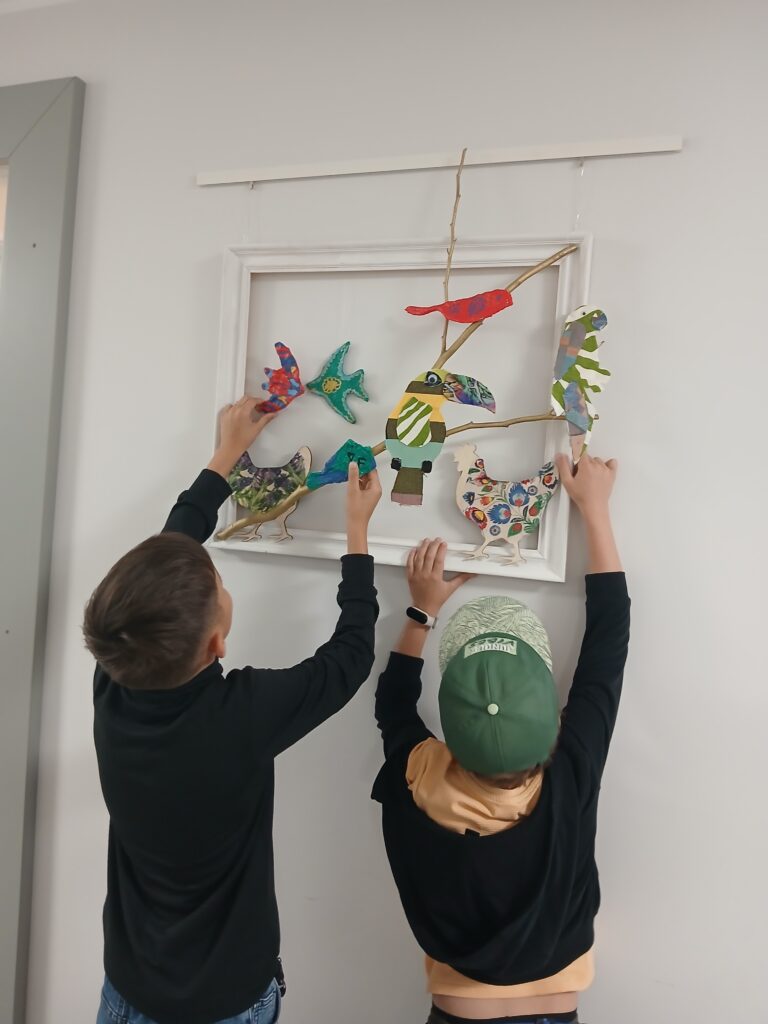 Uczestnicy nie tylko tworzyli – również wspólnie zaplanowali i zorganizowali wystawę, która stanowi podsumowanie tygodnia pracy. „Ptasi Raj” można oglądać na drugim piętrze w Małej Galerii Centrum Kultury – to przestrzeń, w której każdy detal jest przemyślany, a całość opowiada historię pełną koloru, tekstury i wyobraźni naszych młodych artystów.