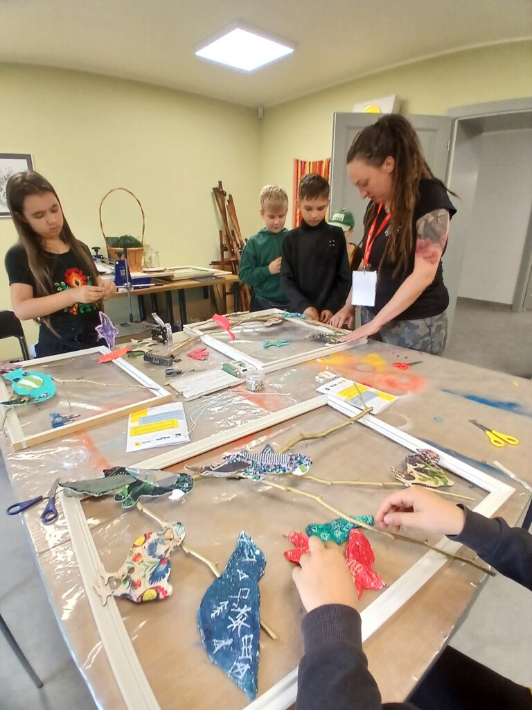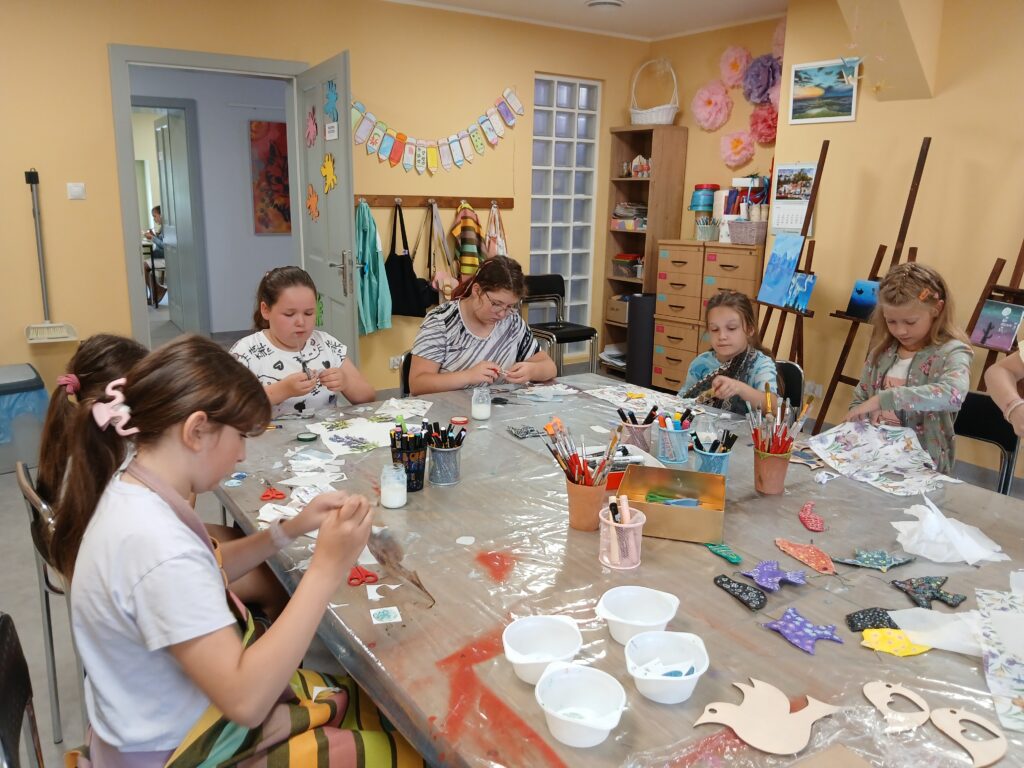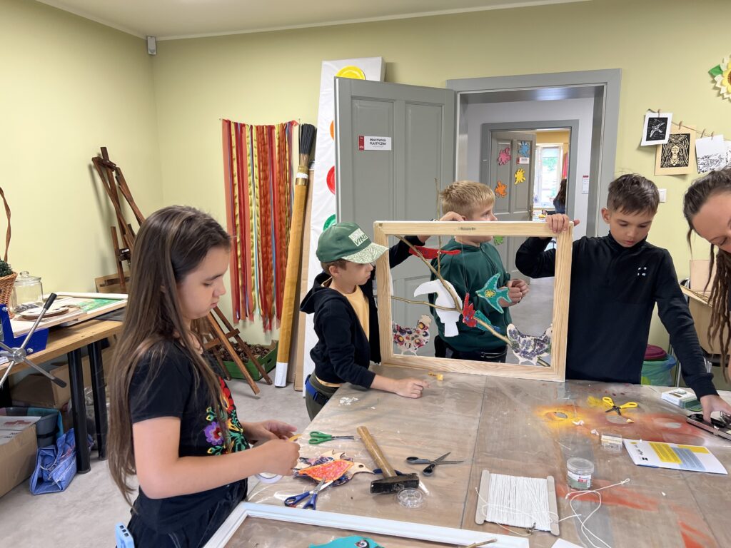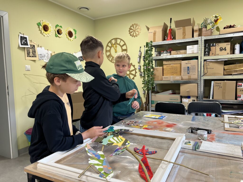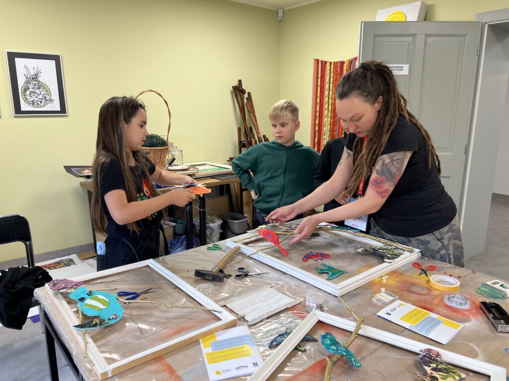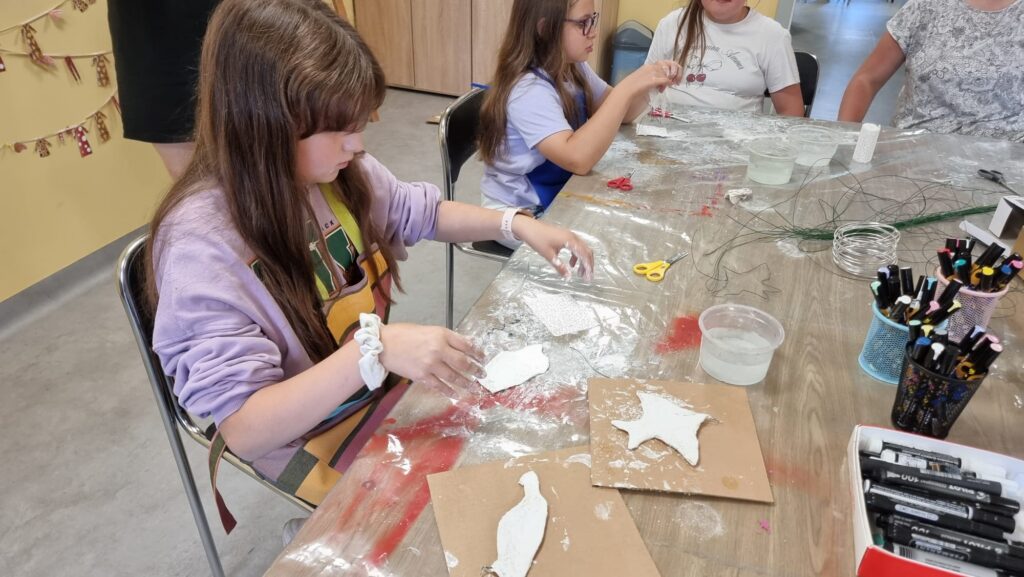 Uczestnicy nie tylko tworzyli – również wspólnie zaplanowali i zorganizowali wystawę, która stanowi podsumowanie tygodnia pracy. „Ptasi Raj” można oglądać na drugim piętrze w Małej Galerii Centrum Kultury – to przestrzeń, w której każdy detal jest przemyślany, a całość opowiada historię pełną koloru, tekstury i wyobraźni naszych młodych artystów.