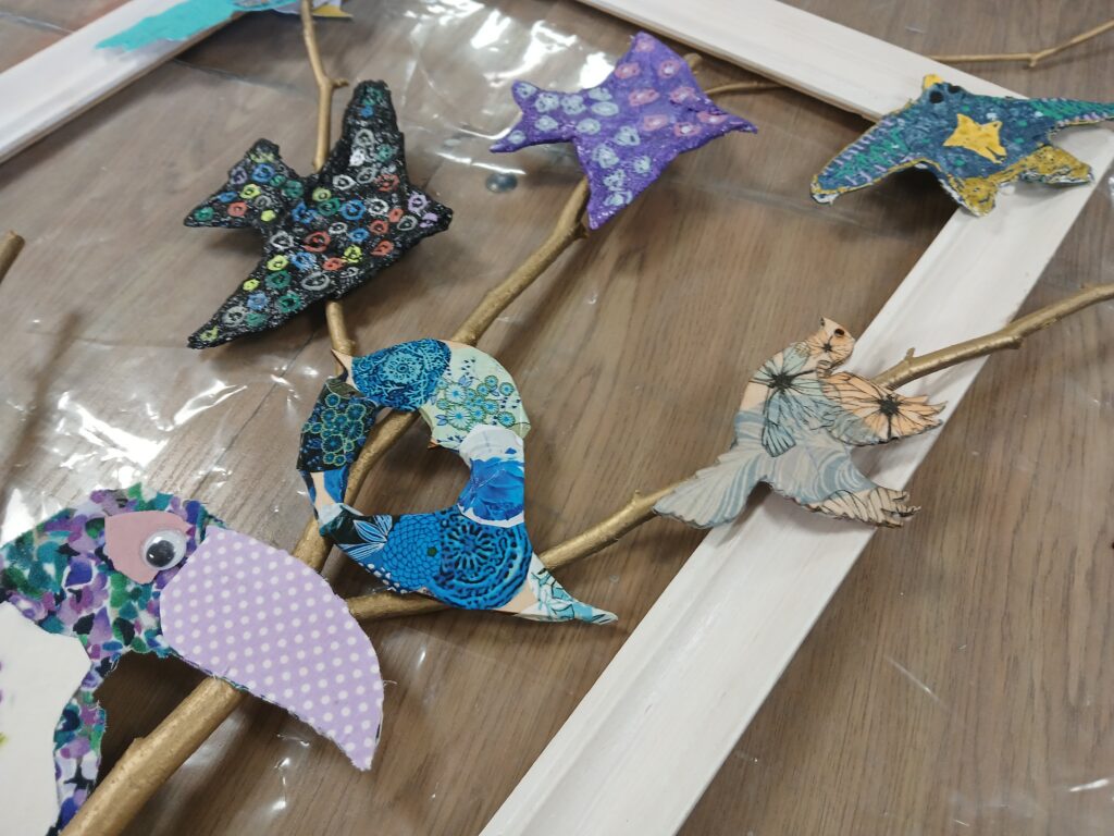 Tematem przewodnim były ptaki, a każdy dzień to nowe materiały i formy: od rzeźb z gipsu, przez tkaniny, aż po drewno i elementy dekoracyjne. Powstawały nie tylko same ptasie sylwetki, ale też ich otoczenie – artystyczne ramy, złote gałęzie i przestrzenne formy, które nadały wystawie niepowtarzalnego charakteru.